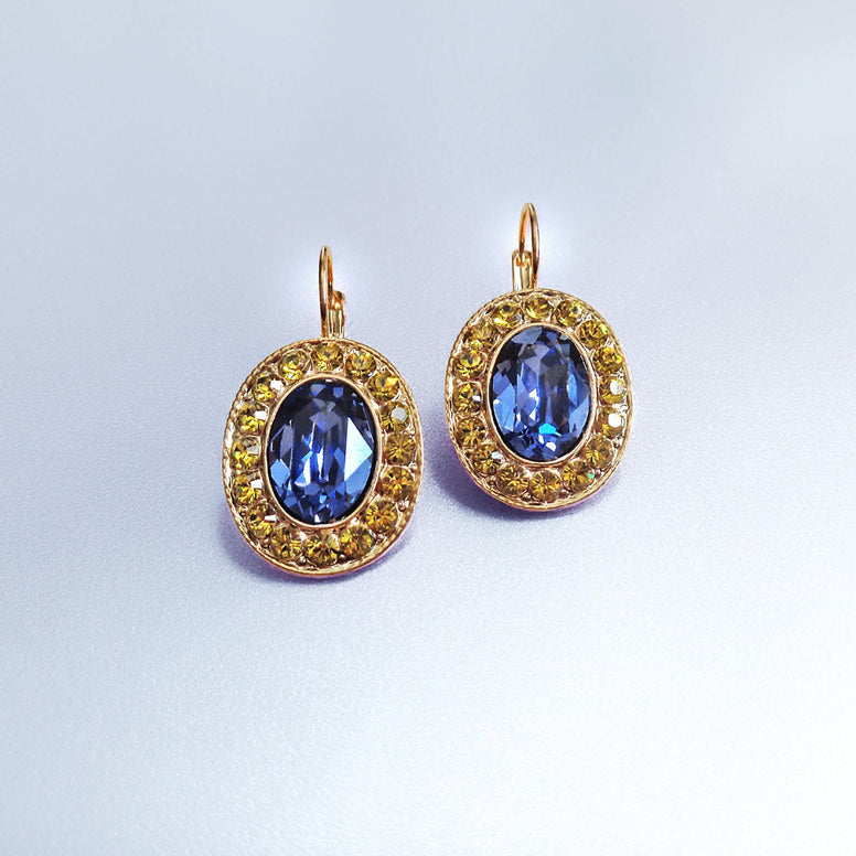 Large drop earrings made with Austrian crystalCrystal colour: tanzanite ,limeMetal : 18k yellow gold plated Length: 36mmWidth: 20mm