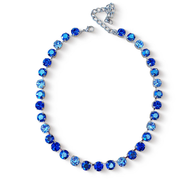 ITEM TYPE: necklace/chokerMATERIAL/GEMSTONE: Austrian crystalCRYSTAL TYPE: 8mm roundCOLOUR: sapphire blueMETAL: rhodium silver plated