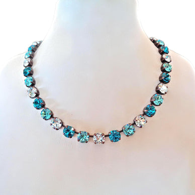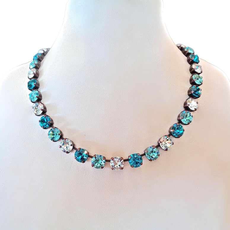 ITEM TYPE: necklace/chokerMATERIAL/GEMSTONE: Austrian crystalCRYSTAL TYPE: 8mm roundCOLOUR: blue zircon,light blue,clearMETAL: antique copper plated
