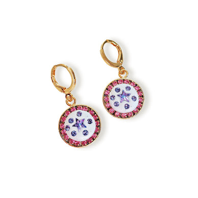 Gold plated round  drop earrings made with Austrian crystals and crystal clay.These are handmade artistic one of a kind pair of earrings made with purple  star rhinestones on white clay and rose halo accents.The top part is a gold plated small huggie hoop which lets the drop graceful hang below.Drop size is 15 mm circular