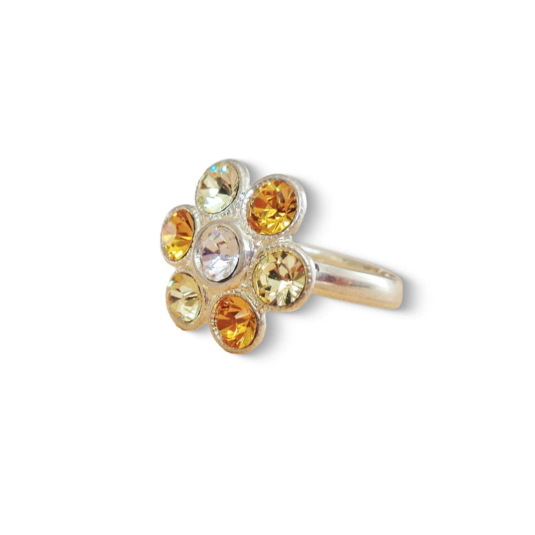 Floral design ring made with Austrian crystal.crystal type: 4,5mm roundcolour: light topaz,lemonband size:17mm diameter