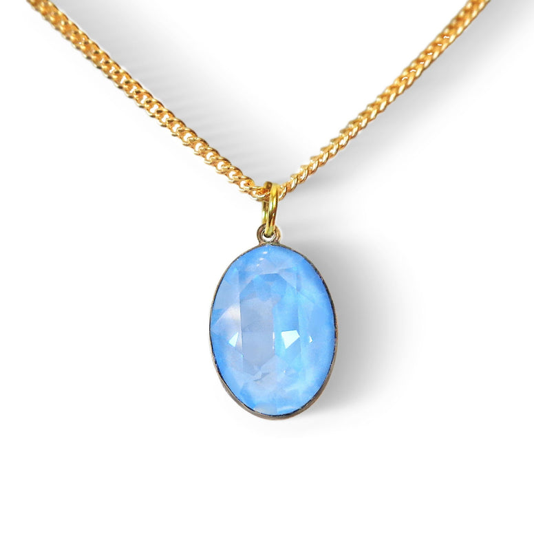 Crystal pendant made with Austrian crystal.crystal type:18X13mm oval colour: sky blueChain length:46cmMetal: fine gold plated