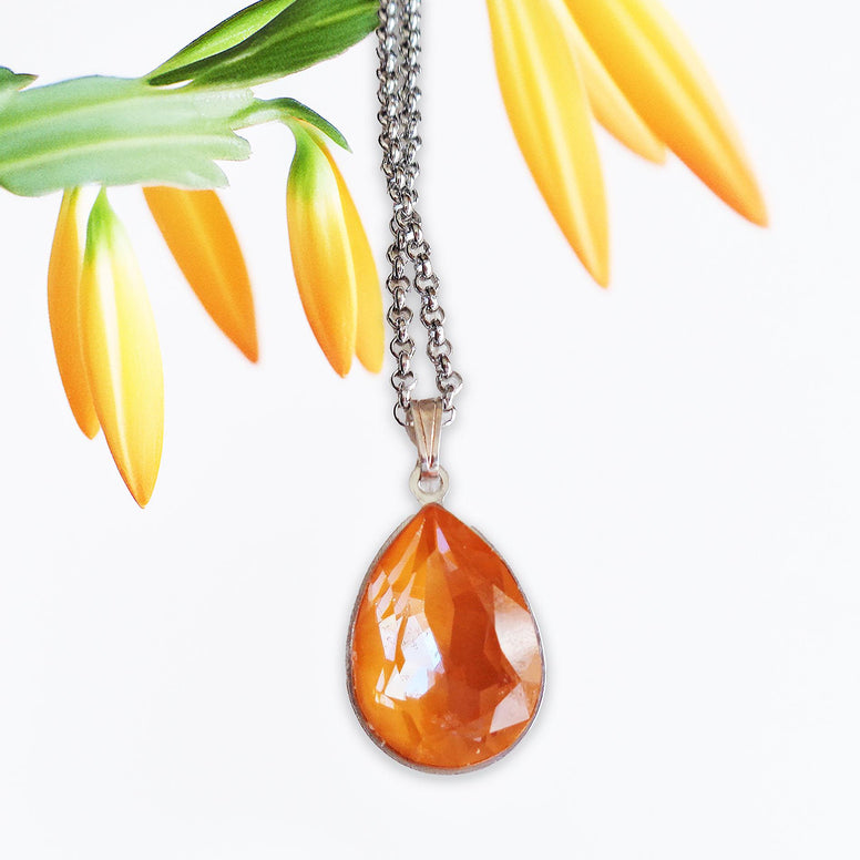 crystal type:18X13mm pear colour: crystal mango igniteChain length:43cm+5Metal: stainless steel chain