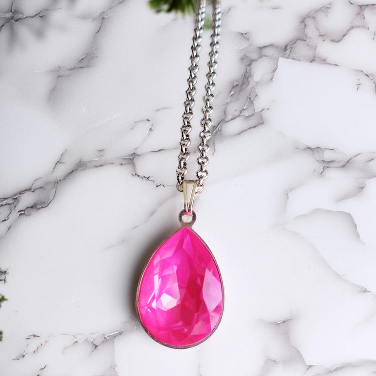 Crystal pendant made with Austrian crystal.crystal type:18X13mm pear colour: electric pinkChain length:43cm+5Metal: rhodium silver plated