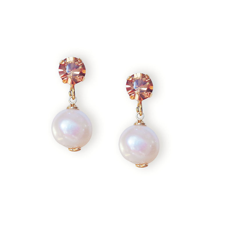 Pair of pearl earrings with light brown accents on a white background.Stud and drop earrings with light brown crystal studs made with Austrian crystals.The pearl drops are freshwater natural pearls colour white