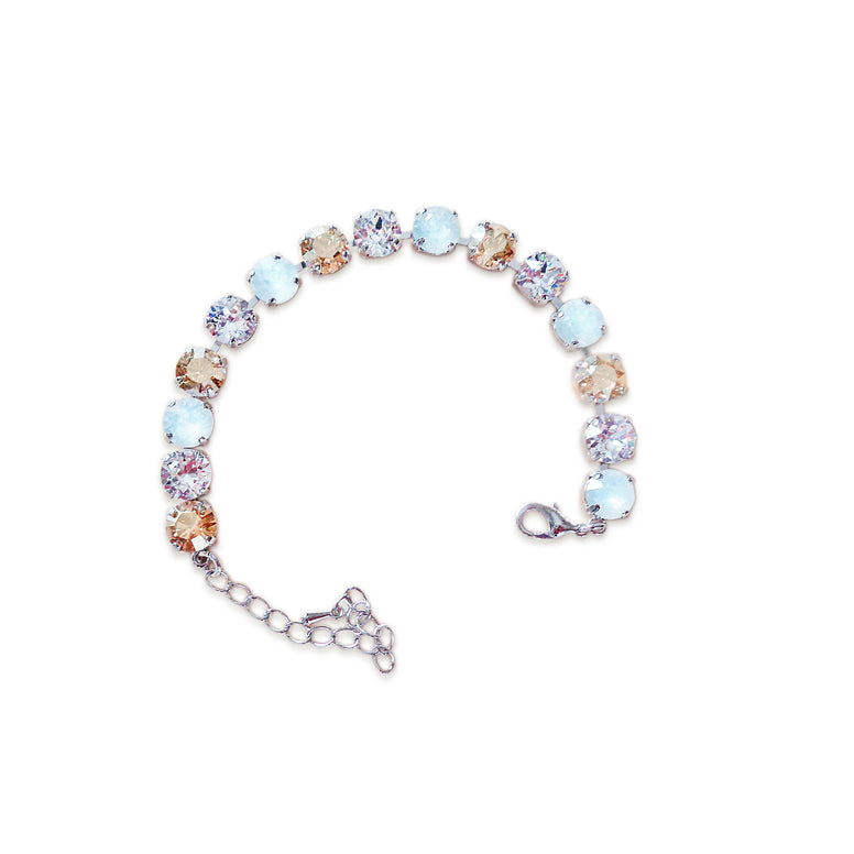 Multicolored tennis  bracelet on a white background.Made with genuine Austrian crystal.A single row of crystals in colours white opal.clear rystal and golden.The bracelet is medium size and fits average wrist.It includes and extension chai