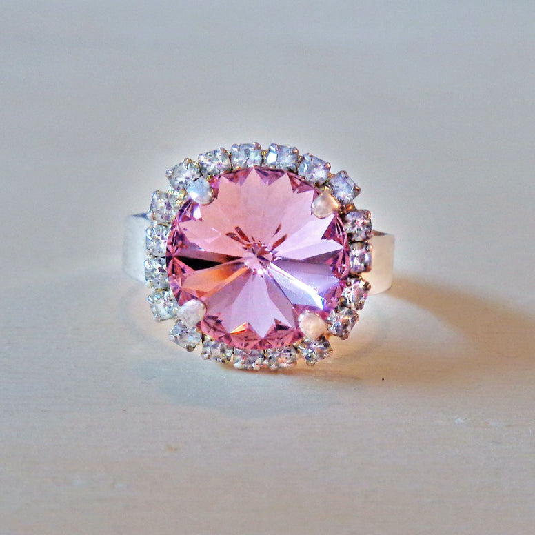 Colour: clear crystal,light roseMetal : rhodium silverCrystal type: 12mm rivoliBand diameter:18mmAdjustable size