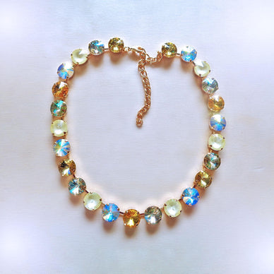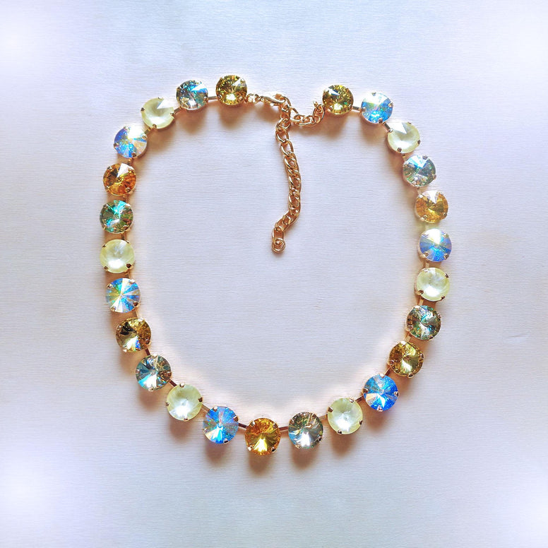 CRYSTAL TYPE: 12mm rivoliNECKLACE SIZE: 35cm+10cmCOLOUR: sunshine delite,light topaz,luminous greenMETAL: yellow gold plated