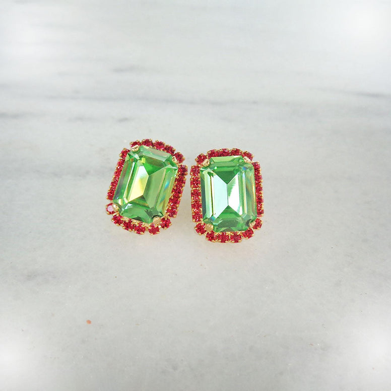 Colour: peridot,pinkMetal setting: gold platedCrystal type: 14x10 rectangle Length: 18mmWidth: 15mm