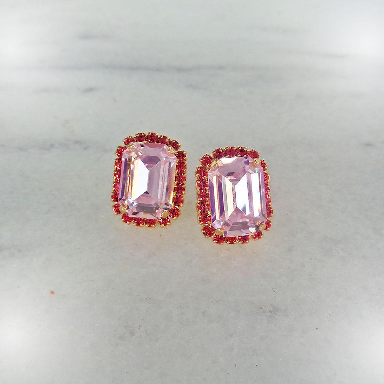 Colour: light rose,pinkMetal setting: 18k goldplatedCrystal type: 14x10 rectangle Length: 18mmWidth: 15mm
