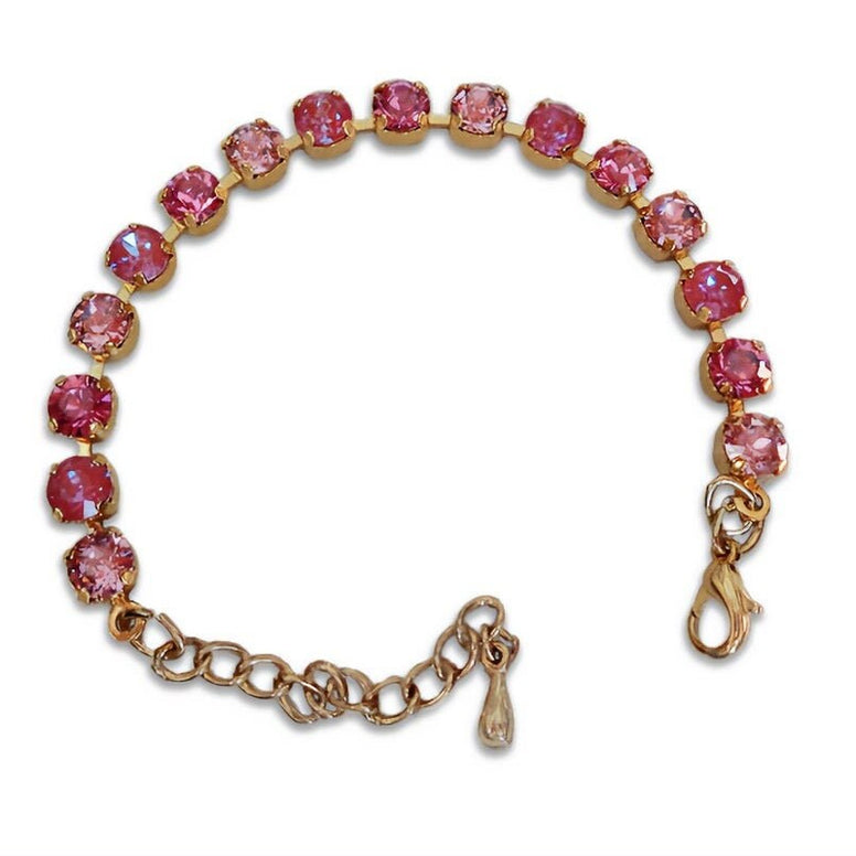 ITEM TYPE: braceletMATERIAL/GEMSTONE: Austrian crystalCRYSTAL TYPE: 6mm roundSIZE: 16,5+3cmCOLOUR: pink shadesMETAL: 18k gold plated