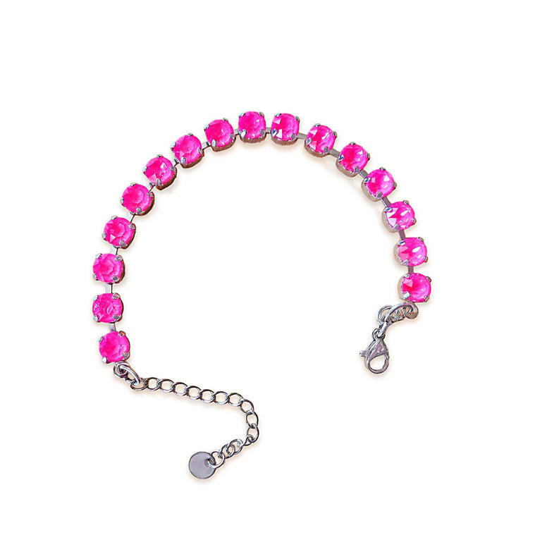 ITEM TYPE: braceletMATERIAL/GEMSTONE: Austrian crystalCRYSTAL TYPE: 6mm roundSIZE: 16+3cmCOLOUR: electric pinkMETAL: rhodium silver plated
