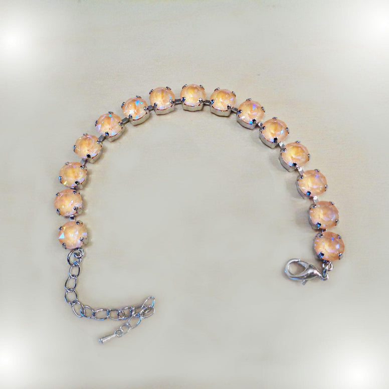ITEM TYPE: braceletMATERIAL/GEMSTONE: Austrian crystalCRYSTAL TYPE: 8mm roundSIZE: 17+3cmCOLOUR: light peach deliteMETAL: rhodium silver plated