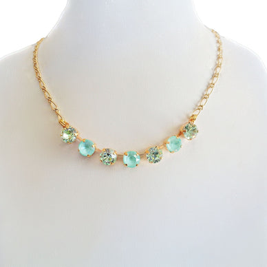CRYSTAL TYPE: 8mm roundNECKLACE SIZE: 45cm+6cmCOLOUR: crysolite,soft mintMETAL: yellow gold plated