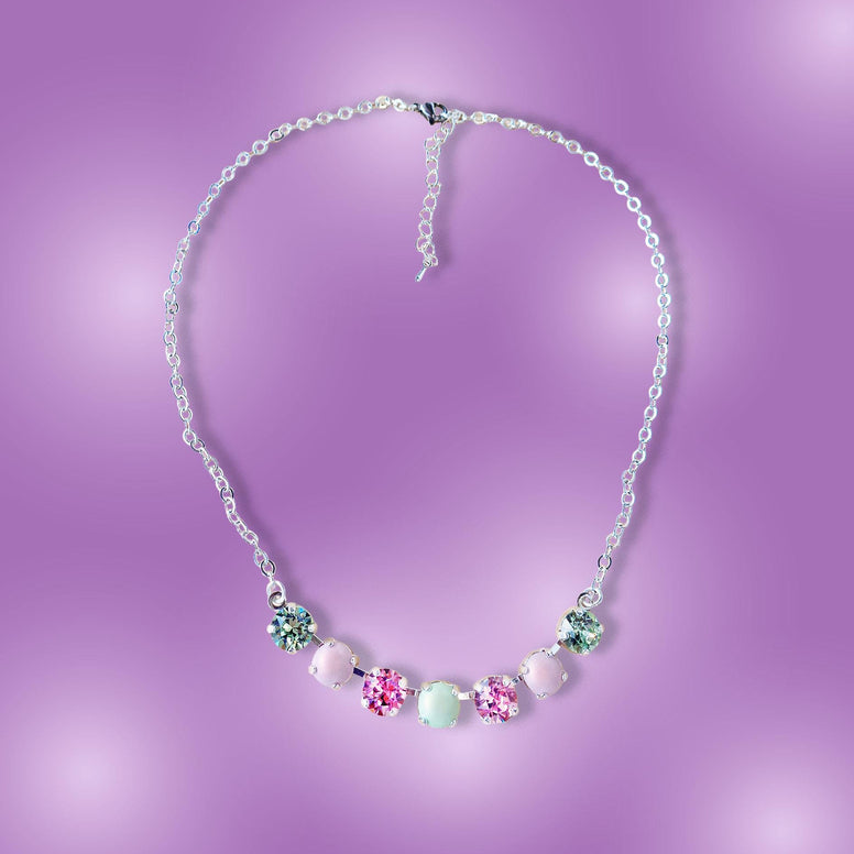 CRYSTAL TYPE: 8mm roundNECKLACE SIZE: 45cm+6cmCOLOUR: pastel green and pinkMETAL: bright silver plated