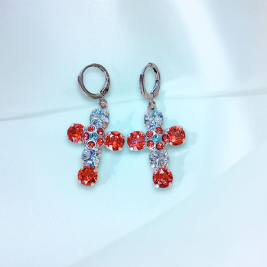 Cross-shaped earrings with red and clight blue gemstones on a light blue