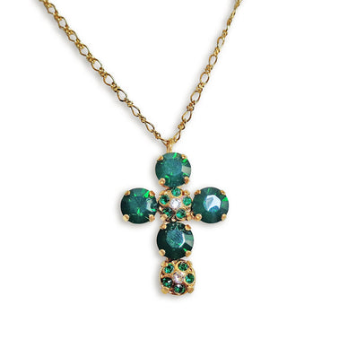 Crystal type: 8mm roundCross size: 32mm long-24mm wideColour:palace green opalmetal: yellow gold platedChain length:40cmm+ 6cm