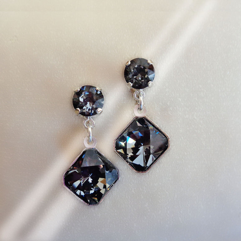 Crystal style: 10mm squareColour: silver night (black)Full length: 28mm ( 1 1/8")Very elegant and light weightHandmade one by one , with care with high quality crystal .Not mass production.JEWELRY CARE:Always remove your jewelry before washing your hands, swimming, or applying body care products such as perfume, hairspray, soaps, and lotions.Store your jewelry in its original packaging or a soft pou.ch to avoid scratching. This also helps to reduce exposure to sunlight and excessive heat, which can fade color