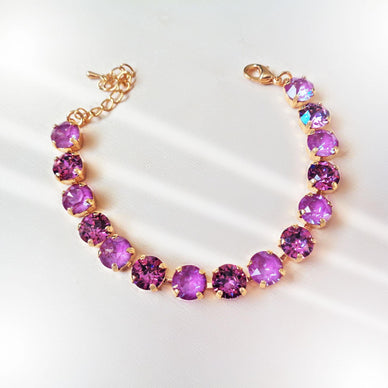 ITEM TYPE: braceletMATERIAL/GEMSTONE: Austrian crystalCRYSTAL TYPE: 8mm roundSIZE: 17+3cmCOLOUR: dark pinkMETAL: 18k gold plated